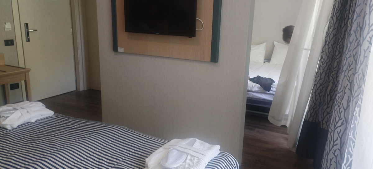 ". Ну, что я вам могу сказать одной фразой: Идеальный отдых! Нам повезло с номером -заселили во 2 корпусе после реновации. Очень чисто, ощущение, что мы первые, кто в него заселился. Белоснежное постельное, полотенца и вафельные халаты, сложенные конвертиками с тапочками. Номер делюкс почти двухкомнатный, поскольку разделён перегородкой. В одной части раскладной диван, в другой двухспальная кровать. Сейф, мини холодильник, плазма и кондиционер имеются. Вот как все выглядит
