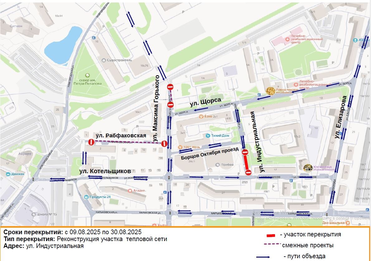 Вниманию автомобилистов! В связи с выполнением реконструкции участка трубопровода тепловой сети в период с 09.08.2025 по 30.08.2025 планируется прекращение движения по автомобильной дороге ул. Индустриальной в районе пересечения с ул. Котельщиков. Участников дорожного движения просим обращать внимание на знаки, заранее планировать маршрут, соблюдать Правила дорожного движения РФ. Возможные маршруты объезда: ул. Борцов Октября, ул. Харьковская, ул. Елизарова. Департамент дорожной инфраструктуры и транспорта