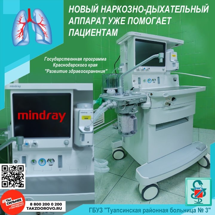 НОВЫЙ НАРКОЗНО-ДЫХАТЕЛЬНЫЙ АППАРАТ УЖЕ ПОМОГАЕТ ПАЦИЕНТАМ В стационаре ГБУЗ «Туапсинская районная больница № 3» по адресу ул. Калараша, 14 введён в эксплуатацию и уже успешно используется новый наркозно-дыхательный аппарат. Аппарат закуплен за счёт средств краевого бюджета в рамках государственной программы Краснодарского края "Развитие здравоохранения" комплекса процессных мероприятий "Приобретение движимого имущества для развития оказания медицинской помощи, обеспечения ее качества и доступности для граждан" и передан больнице безвозмездно. Новое оборудование используется врачами анестезиологами-реаниматологами в операционном блоке и позволяет точно дозировать анестетики и обеспечивать адекватную анестезию пациента, чтобы он не чувствовал боли и не осознавал операцию. Применение нового аппарата соответствует высокому стандарту оказания медицинской помощи и способствует улучшению результатов лечения для пациентов. #укреплениеобщественногоздоровья