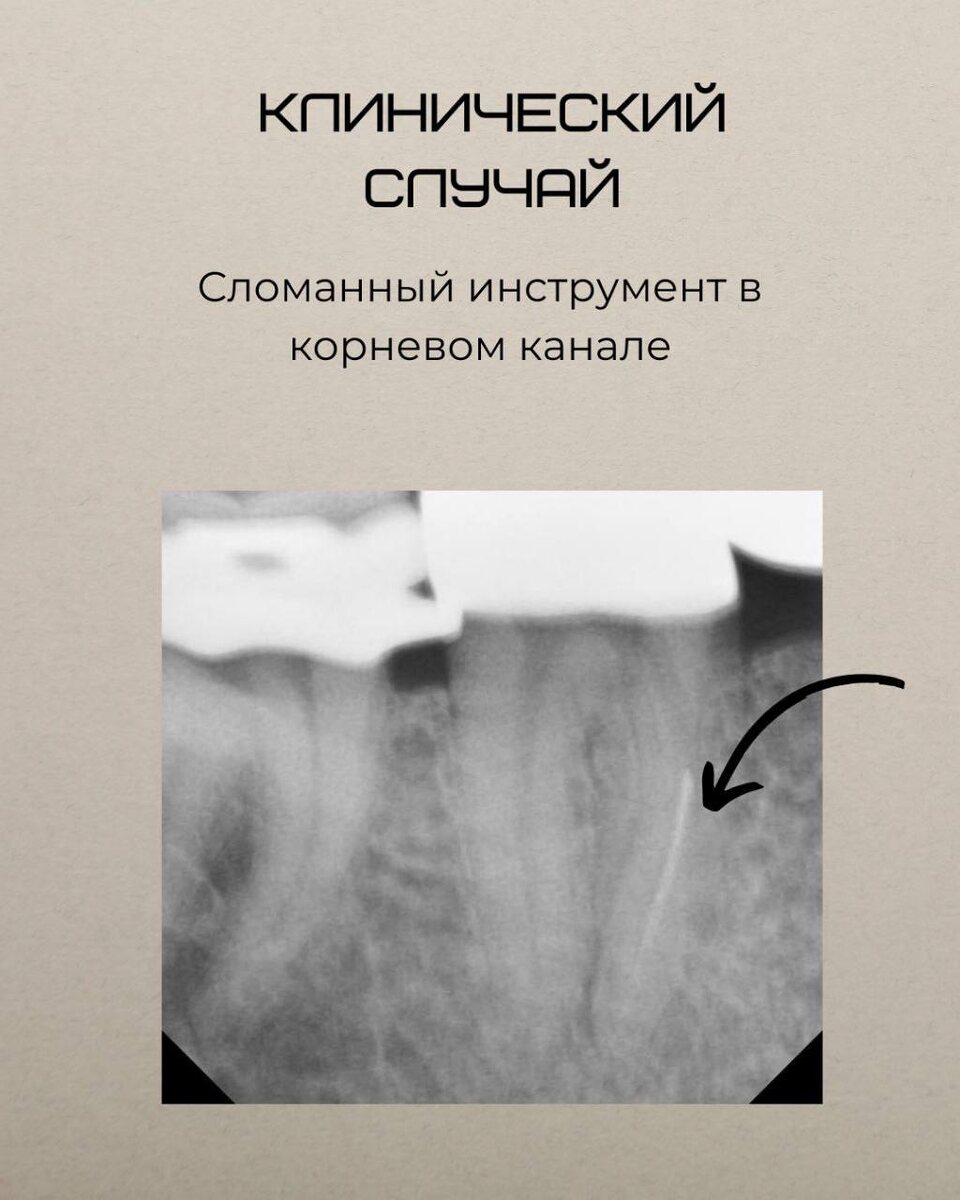 К нам обратился пациент с жалобами на боль в зубе. После диагностики выяснилось, что в канале имеется сломанный инструмент, который препятствует его обработке. Его необходимо извлечь, чтобы качественно провести лечение. 🔍 Что было сделано? 1. Извлечение сломанного инструмента: Доктор использовал специализированные инструменты и методики для аккуратного извлечения обломка из корневого канала, такие как ультразвуковые насадки и эндодонтическое лассо. 2. Тщательная очистка канала: После извлечения врач провел полную дезинфекцию и очистку корневого канала, чтобы устранить все возможные инфекции и подготовить его к пломбированию. 3. Пломбирование: Канал был запломбирован материалом, который надежно запечатает просвет корневого канала и защитит зуб от повторного заражения, обеспечивая его долгую службу. 💪 Почему это важно? Сломанный инструмент в корневом канале становится серьезной проблемой, если источник инфекции находится именно в этом канале. Необходимо создать доступ к нему для эф