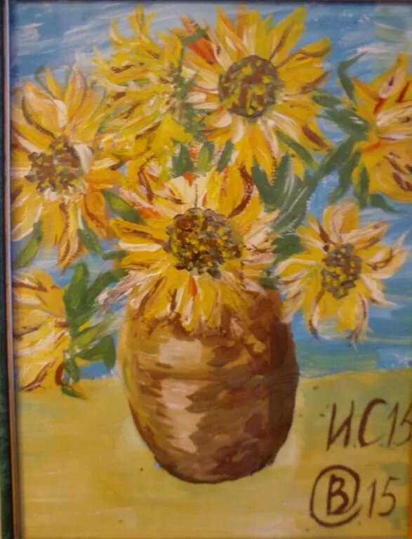 подсолнухи. Плохого в этом нет ничего. Ван Гог отрыл нам интересное направление. И я тоже написала свою картину с подсолнухами. Дома картины нет. Я подарила ее доктору, когда лежала в больнице в очередной раз. Ей было приятно. И мне тоже. Надеюсь, и вам понравится моя работа. Заходите ко мне в гости. Я