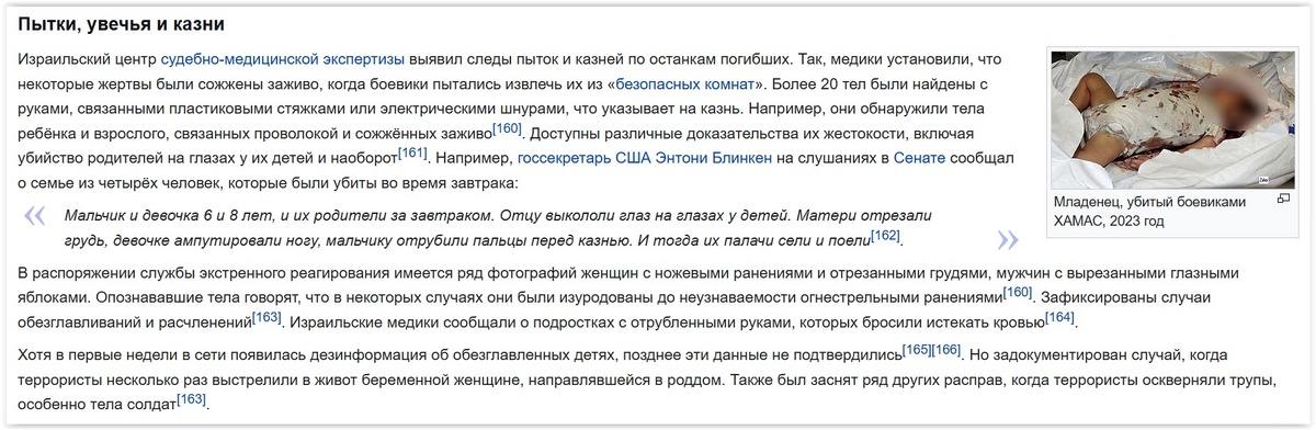 Я бы и не придирался, но по какой-то причине 9-й канал молчит как партизан о причинах израильских бомбежек. О том, что под больницами и школами находятся склады оружия, о том, что Израиль заранее предупреждает об ударах по таким объектам, чтобы люди могли эвакуироваться. Мало того, зачастую тратятся две ракеты: с первой по цели прилетает пустая болванка, а потом уж и боевой заряд - для особо тормозных. Нам ничего не говорят о событиях 7-го октября 2023-го, когда толпа "мирных жителей Газы" ворвалась на еврейскую территорию и устроила массовые убийства с захватом 251 заложника, среди которых подавляющее большинство - мирные жители, включая грудных детей (которых в последствии убили). Очень вяло озвучивают тот факт, что до сих пор освобождены не все заложники. Новости не рассказывают, как мирная арабская толпа издевалась над своими жертвами (я вам привожу скриншоты из Википедии и они полностью подтверждают рассказы моих знакомых из Израиля).