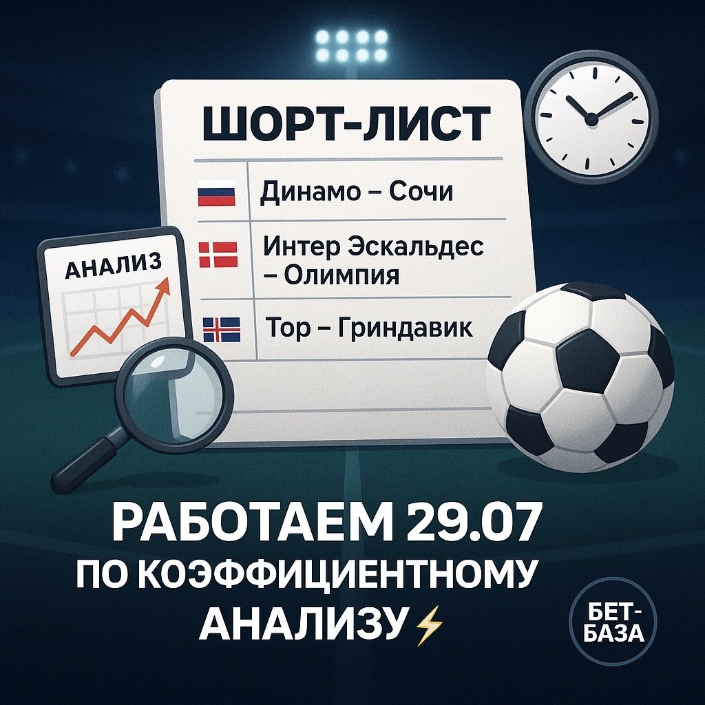 📊 Коэффициентный анализ по Бет-Базе Телеграм-канал 🇷🇺 Россия. Кубок Три матча. Хочется выделить встречу Динамо Москва – ФК Сочи. Жду интересный сюжет, но главное — гол в первом тайме ⚽️ С какой стороны — неясно, но сигналы сильные. 👉 ТБ 1 в 1Т — коэффициент 1.60. Не подарок, но крепко и, возможно, с возвратом. 🇪🇺 Лига чемпионов UEFA Пять матчей. Не самые простые игры сегодня. Очень надеюсь, что Дрита наконец-то забьет гол в ворота ФК Копенгаген. В целом, день такой, где можно цеплять: — либо коэффициенты 1.60–1.90 — либо уже заходить на высокие кэфы от 3.50+ ⚠️ Котировки в районе 2.00 букмекеры сегодня легко не отдадут. Берите турнир в проработку и анализируйте. 📌 Не обязательно играть только по моим мыслям. 🇪🇺 Лига конференций UEFA Три встречи. Выделю матч Интер Эскальдес – Олимпия Любляна. Есть тренд в сторону П2, и он основан на двух свежих играх. Матмодель это подтверждает. Вероятно, тренд может повториться. Остальные встречи — на самостоятельный анализ. 🇮🇸 Исландия. 1-й