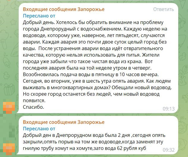 В Днепрорудном произошла новая коммунальная авария, оставившая без воды жителей не только самого города, но и близлежащих населенных пунктов. С утра 29 июля редакция почти в режиме нон-стоп получала сообщения от местных жителей об отсутствии водоснабжения в городе. Читатели «Блокнота» пишут, что утечки на водоводе случаются едва ли не каждую неделю, из-за чего горожане надолго остаются без H2O. «Каждая авария – это почти двое суток целый город без воды. После устранения аварии вода идёт отвратительного качества, которую нельзя использовать для питья. Жители города уже забыли, что такое чистая вода из крана», – отмечает наша подписчица. По её словам, крайняя утечка произошла на прошлой неделе в четверг утром. Возобновилась подача воды в пятницу в 22 часа. Сегодня, 29 июля, уже в шесть утра снова случилась авария. Жители Днепрорудного не понимают, как им выживать в многоквартирных домах. «Обещали новый водовод, где он? Скорее город останется без людей, чем новый водовод появится…» – него