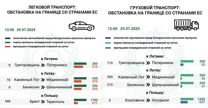 В Государственном таможенном комитете Беларуси заявили: «В течение двух часов польская сторона в пункте пропуска „Тересполь“ практически не принимала легковые автомобили, следующие из Беларуси. С 08:00 до 09:00 оформлено лишь четыре авто, с 09:00 до 10:00 — ни одного. При стабильной работе польских контролирующих служб за такое время возможно оформить 140». В последние часы, по сообщению таможни, движение несколько скорректировалось: территорию белорусского пункта пропуска «Брест» покинули 37 автомобилей. — Очередь на выезд из-за неритмичной работы польской стороны начала формироваться еще в выходные и в сравнении с прошлой неделей выросла в семь раз. Сейчас выезда на польскую сторону ожидает более 940 автомобилей, — сообщили в ГТК. Там напомнили, что представленная на белорусской стороне возможность по регистрации в электронной очереди и пребыванию до времени вызова на границу в любом разрешенном для этого месте несколько улучшает условия ожидания выезда на сопредельную сторону. Госпо