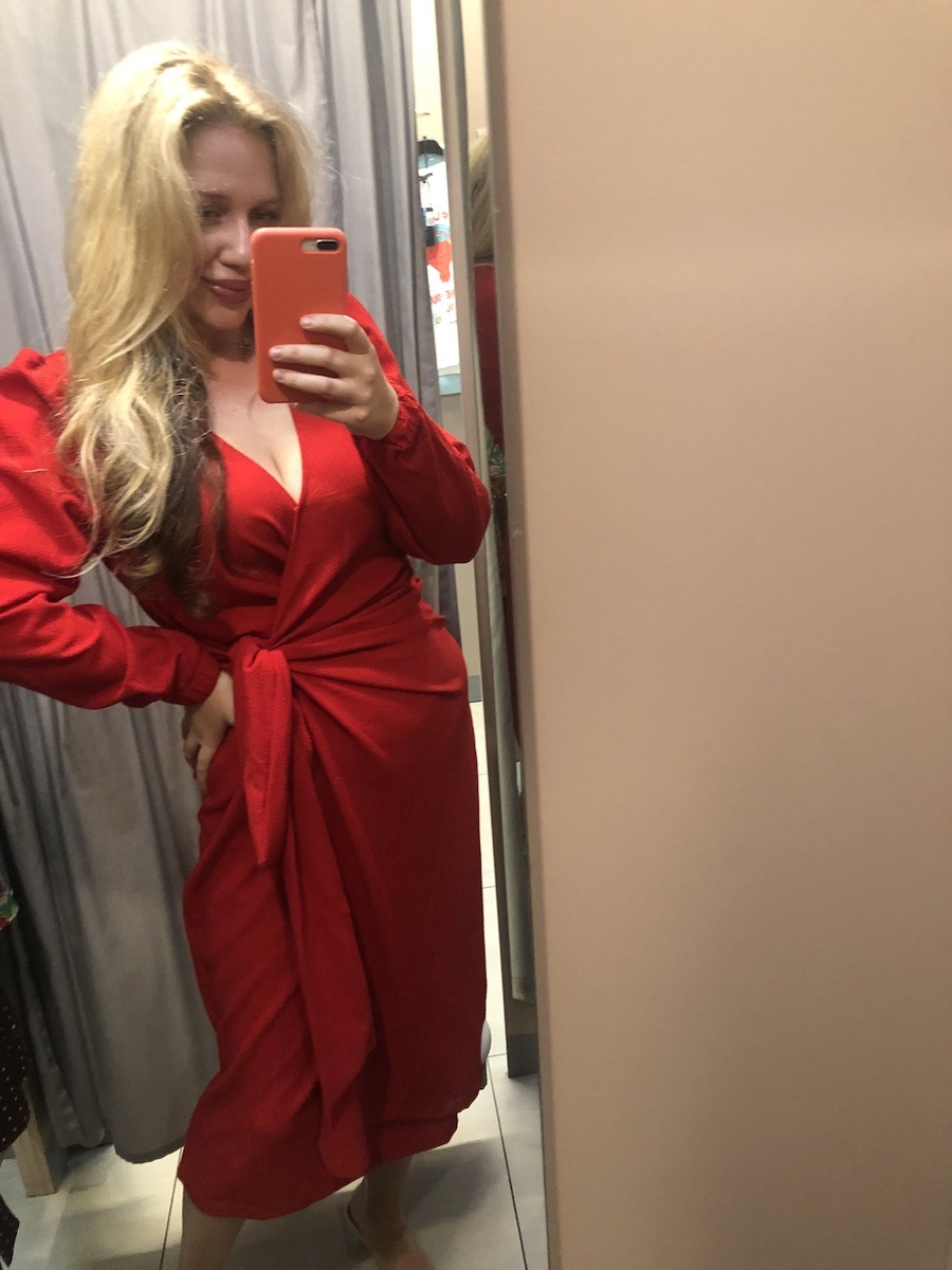Я не остановилась на примерке атласного мини платья, взяла также длинное. Ткань в целом приятная, трикотаж. Плотная, летом будет жарко, поэтому больше рассчитано на демисезон, в офис, под плащ и т.д. Фасон относится к виду «платье на запах», «платье-халат». Длина пришлась кстати. Не люблю непонятную длину, которая «режет» силуэт в самом неподходящем месте. Для меня – либо мини, хотя бы на ладонь выше колена или короче, либо миди-макси – ниже середины икры, до щиколотки или практически в пол. Длину до колена и чуть ниже не признаю. Хотя опять же зависит от фасона: если вещь очень понравится, критичность снижается. На мой рост 173 длина ниже середины икры, на дамах пониже будет макси. Посмотрела на их официальном сайте – длина платья – 127 см. Запахнуть можно как душе угодно Запах очень удобный. Внутри есть дополнительная фиксация и скрытая пуговичка. Основной запах на длинный пояс – просто замечательный. А то на некоторых платьях встречаются неуверенные завязочки и бывает неясно – п