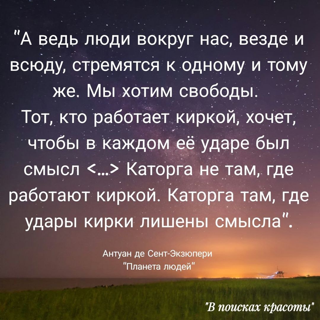 ⚘️В офисном окружении, среди коллег все чаще звучит вопрос о том, почему мы так морально устаем от в сущности простой работы? Почему так жалуемся на неё? Злимся на коллег? Как по мне, хороший ответ дал когда-то один из любимых моих писателей Антуан де Сент-Экзюпери в своём романе "Планета людей"... Все дело в осознании бесполезности своей работы - именно поэтому она воспринимается негативно, как "каторга"... А вы согласны с мнением замечательного французского писателя?