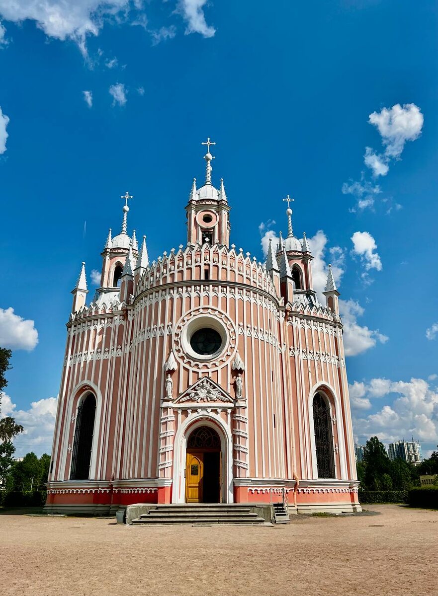 Чесменская церковь (официальное название - Церковь Рождества Иоанна Предтечи) расположилась среди жилых кварталов в Московском районе. Смотрится она необычно: то ли волшебный домик, то ли большая новогодняя игрушка. Чесменский дворец, спрятанный среди зелени напротив храма напоминает, скорее, Инженерный замок и смотрится куда менее празднично. Он был построен в 1774-1777г. по проекту архитектора Ю. Фельтена, использовался как место отдыха императрицы Екатерины II по пути в Царское село и именовался Кекерикетсинским, по названию местности Кекерики (В переводе с финского "кекерики" - "лягушачье болото"). По преданию, именно здесь императрица получила весть о победе русского флота над турецким в местечке Чешме, и дворец переименовала. В Чесменский. А напротив дворца отстроили Чесменскую церковь. Вход в нее украшают две статуи (Вера и Надежда) и барельеф с изображением всевидящего ока. Внутри - все достаточно аскетично, но нужно понимать, что после революции храму пришлось многое пережи