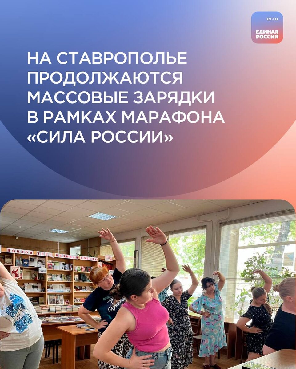 Всероссийский спортивный марафон «Сила России» организован сторонниками «Единой России» и проводится для популяризации здорового образа жизни и физической активности населения. В городской Центральной детской библиотеке им. А.С. Пушкина г. Георгиевска прошла оздоровительная гимнастика для сотрудников учреждения. Исполнительный секретарь местного отделения партии Татьяна Бондарева показала простые и полезные упражнения особенно для тех, кто ведёт малоподвижный образ жизни. В Курском сельском Доме культуры «Восход» активисты местного отделения «Единой России» провели зарядку для воспитанников Курского социально-реабилитационного центра для несовершеннолетних «Надежда». Представитель партии Анастасия Хлебникова показала ребятам комплекс упражнений, направленных на укрепление мышц и улучшение дыхания.