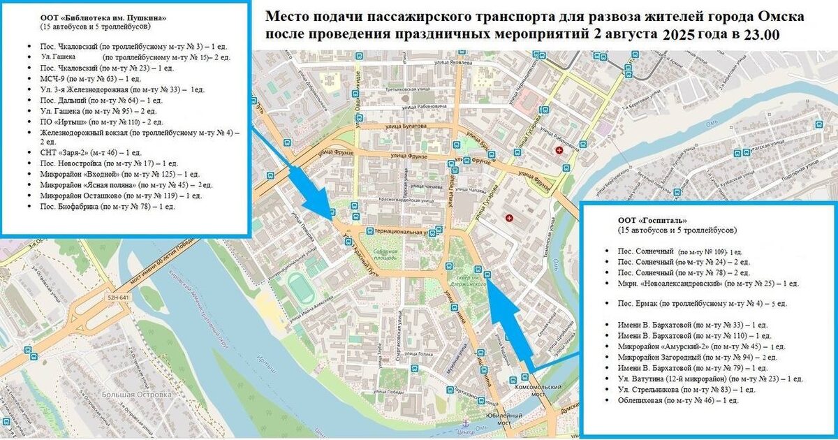 🚎 После завершения праздничной программы в честь Дня города и Омской области омичей развезет общественный транспорт. 📌 2 августа к 23:00 к остановочным пунктам «Библиотека им. Пушкина» и «Госпиталь» будут поданы дополнительные 30 автобусов и 10 троллейбусов. Транспорт поедет по самым востребованным маршрутам. Направления движения и количество подвижного состава указаны на схеме. Прошу вас внимательно с ней ознакомиться,- говорит Сергей Шелест. ❗️Оплата проезда будет производиться по городскому тарифу.