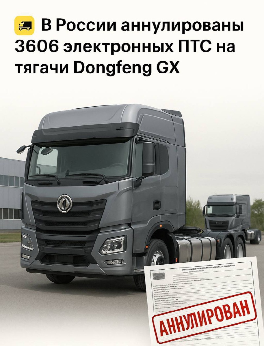Росстандарт признал недействительным Одобрение типа транспортного средства (ОТТС) на магистральные седельные тягачи Dongfeng GX. Причина — серьёзные расхождения между товарными машинами и теми, что были предоставлены на сертификационные испытания. 📉 В итоге 3606 ЭПТС уже получили статус «аннулированный». Это означает, что техника официально не соответствует обязательным требованиям безопасности и не может использоваться на законных основаниях. Для справки: Dongfeng GX — флагман линейки, оснащённый мотором Cummins 508 л.с. и коробкой передач Eaton на 12 ступеней. Машина создавалась под магистральные перевозки, но теперь оказалась вне игры. ❕Под пристальным вниманием регуляторов сейчас и другие китайские бренды — FAW и SITRAK. 🔄 Если в вашем парке есть такие тягачи — проверьте статус ЭПТС и держите связь с поставщиком. 📍Такие прецеденты — тревожный сигнал для всего рынка. Сложности могут возникнуть не только с регистрацией, но и с страхованием, лизингом и дальнейшей перепродажей
