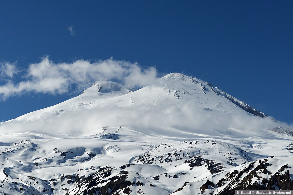 Восточная вершина — 5 621 м, чаще выбирается новичками из-за удобного маршрута. - Форма: хотя Эльбрус внешне похож на конус вулкана, его основание имеет форму овального плато диаметром 30 км. Это делает его скорее щитовым вулканом, уплощённым из-за застывшей лавы.