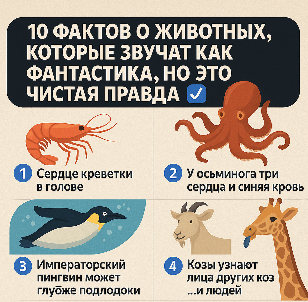 Животный мир полон сюрпризов — настолько, что иногда кажется, будто это сцены из фантастического фильма. Ниже — 10 удивительных, но проверенных фактов, которые доказывают: природа — лучший из сценаристов. У креветки анатомически сердце расположено рядом с мозгом, прямо за головой. Более того, у них нет лёгких — они дышат с помощью жабр. 🫀 Два сердца качают кровь к жабрам, а третье — ко всем остальным органам.