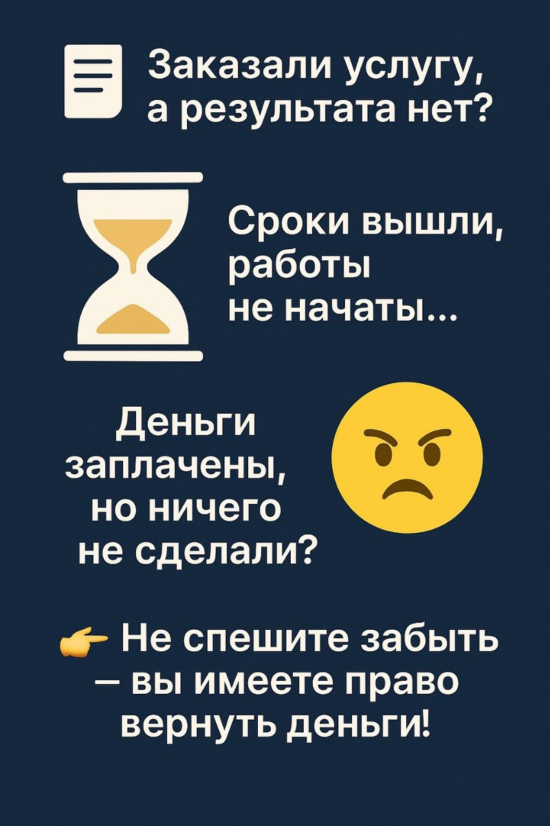Ответ юриста: нужно ли платить, если услуги не оказали? 📄 Заказали услугу — сроки прошли, результата нет? Вы вправе: ✔ расторгнуть договор ✔ вернуть деньги ✔ получить компенсацию 📲 Опишите ваш случай — скажем, как правильно оформить возврат.