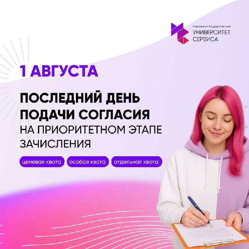 📢Абитуриенты приоритетной волны, не пропустите! ❗️Напоминаем, что 1 августа в 13:00 завершается срок подачи согласия на зачисление по целевой, особой и отдельной квотам. ⚠️Без согласия зачисление на бюджет невозможно! Если уже приняли решение, подтвердите его вовремя. Согласие можно подать: ✔️лично в приёмной комиссии ✔️через удобный Суперсервис Контакты приемной комиссии: 📱 @PVGUSPRIEM 📞+7 (8482) 22-22-83 ✉️priem@tolgas.ru 📍г. Тольятти, ул.Гагарина,4 #ПВГУС #приемнаякампания #абитуриент2025 #поступление #университетсервиса #целевойприем #целеваяквота