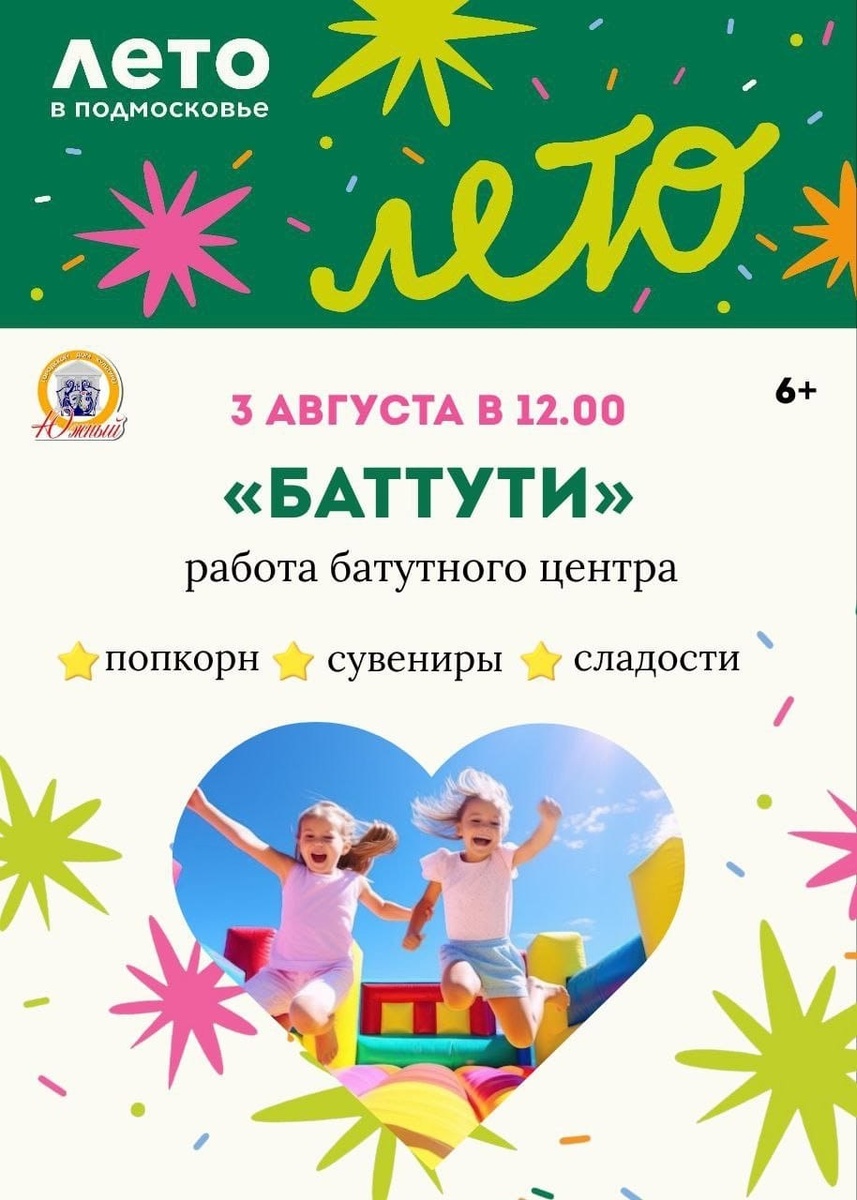 ✨ Дорогие друзья! Приглашаем всех весело провести время и попрыгать на батутах👧🏼🎉 Кроме того, можно будет приобрести вкусный попкорн, разнообразные сувениры и сладости, которые обязательно поднимут настроение 🍿✨ 🚫 Возраст: 6+ 📆 03.08.2025🕒12:00 🏢 Городской дом культуры «Южный» 📍 г.о.Домодедово, мкрн.Барыбино, ул.Южная, стр1А ✅ Мероприятия Домодедово https://dzen.ru/id/66f10385cc4c5a16f7b5fb02 http://vk.com/domodedovo_events http://dzen.ru/domodedovo_events
