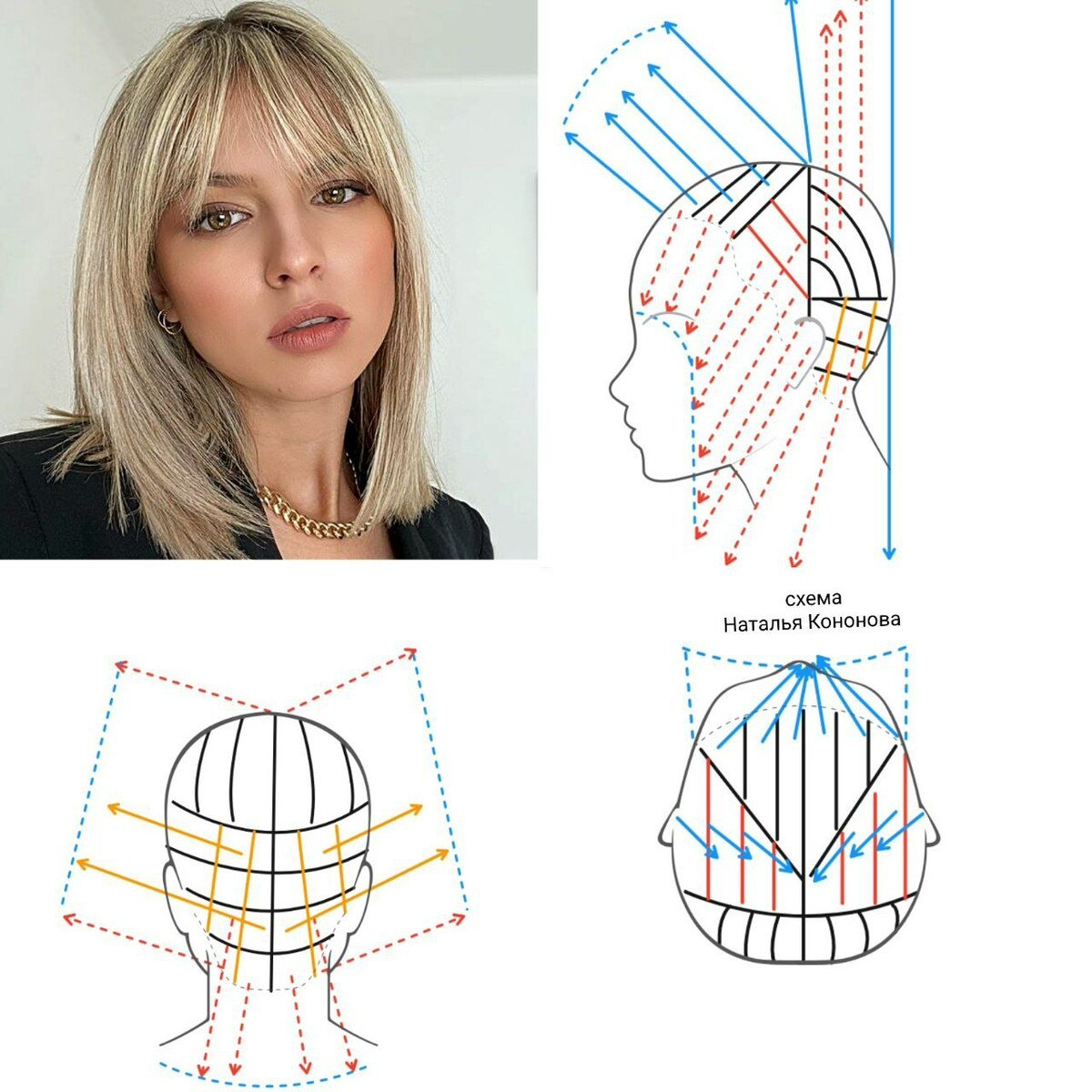 🔹 Верхняя теменная зона — диагональные проборы, направленные назад, создают мягкий переход без перепадов. 🟢 Для защиты слабых волос 📌 Чёлку можно адаптировать: от прямой до удлинённой диагональной. А можно вообще обойтись без неё — вся конструкция от этого не страдает. ✨ Кому подойдёт: