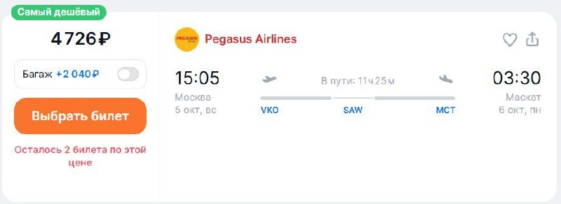 Pegasus Airlines объявила о распродаже билетов на внутренние и международные рейсы. Воспользоваться скидкой можно в период с 29 июля по 3 августа, дисконт распространяется на вылеты с 11 августа по 25 октября. Из России выбор дешевых перелетов небольшой, но все же есть. Например, из Москвы в Оман за 4700 руб. или Саудовскую Аравию – за 4900 руб. А из Петербурга предлагается Бахрейн или Кельн за 9 тыс. руб. Пассажирам, выбирающим эту авиакомпанию, стоит помнить, что вес бесплатной ручной клади не должен превышать 3 кг, а багаж, как и большинство дополнительных услуг, только за плату. Подробнее написали на ТурДоме. @tourdom