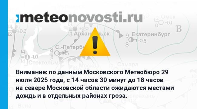 Внимание: по данным Московского Метеобюро 29 июля 2025 года, с 14 часов 30 минут до 18 часов на севере Московской области ожидаются местами