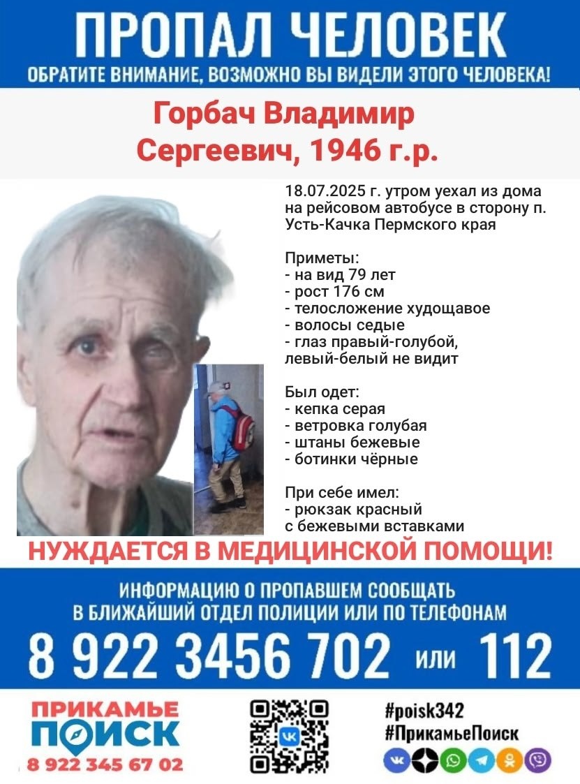 ❗ВНИМАНИЕ! ПОИСК ПРОДОЛЖАЕТСЯ❗ ГОРБАЧ ВЛАДИМИР СЕРГЕЕВИЧ 1946 г.р. 18.07.2025 г. утром уехал из дома на рейсовом автобусе в сторону п.Усть-Качка Пермского края Если вам что-либо известно о пропавшем человеке, просьба сообщить по телефонам: 8 922 34567 02 или 112 #ПрикамьеПоиск #Пермь #УстьКачка #Усть_Качка