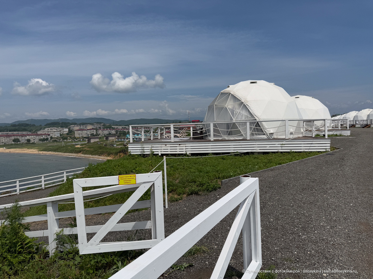 И стоит ли туда ехать. Я побывала в этом месте и могу показать, как всё выглядит изнутри. Понятно, что выбирать лучшие и худшие места — не самое благодарное занятие. Но тут у меня вполне чёткие данные. Глемпинг "Атмосфера" в Приморском крае был признан лучшим глемпингом России в народном голосовании Национальной туристической премии «Маршрут построен 2024-2025». На мысе в посёлке Южно-Морской сейчас находятся 15 сфер, рядом с каждой находится небольшая купель и пара шезлонгов. Расположение действительно живописное: с одной стороны открывается вид на бухту, с другой — виднеются сопки, покрытые лесом. Тут же рядом расположен маяк Фёдора Конюхова. А в одном из "шариков" даже жил Фёдор перед стартом одной из своих экспедиций. Кстати, на моих фотографиях именно этот номер. В самом куполе вполне комфортно. Особенно по меркам глемпингов (ведь по сути это как палатка): полноценная двуспальная кровать, хорошее белье, есть обогреватель и кондиционер, санузел с душем и даже спальное место на "в