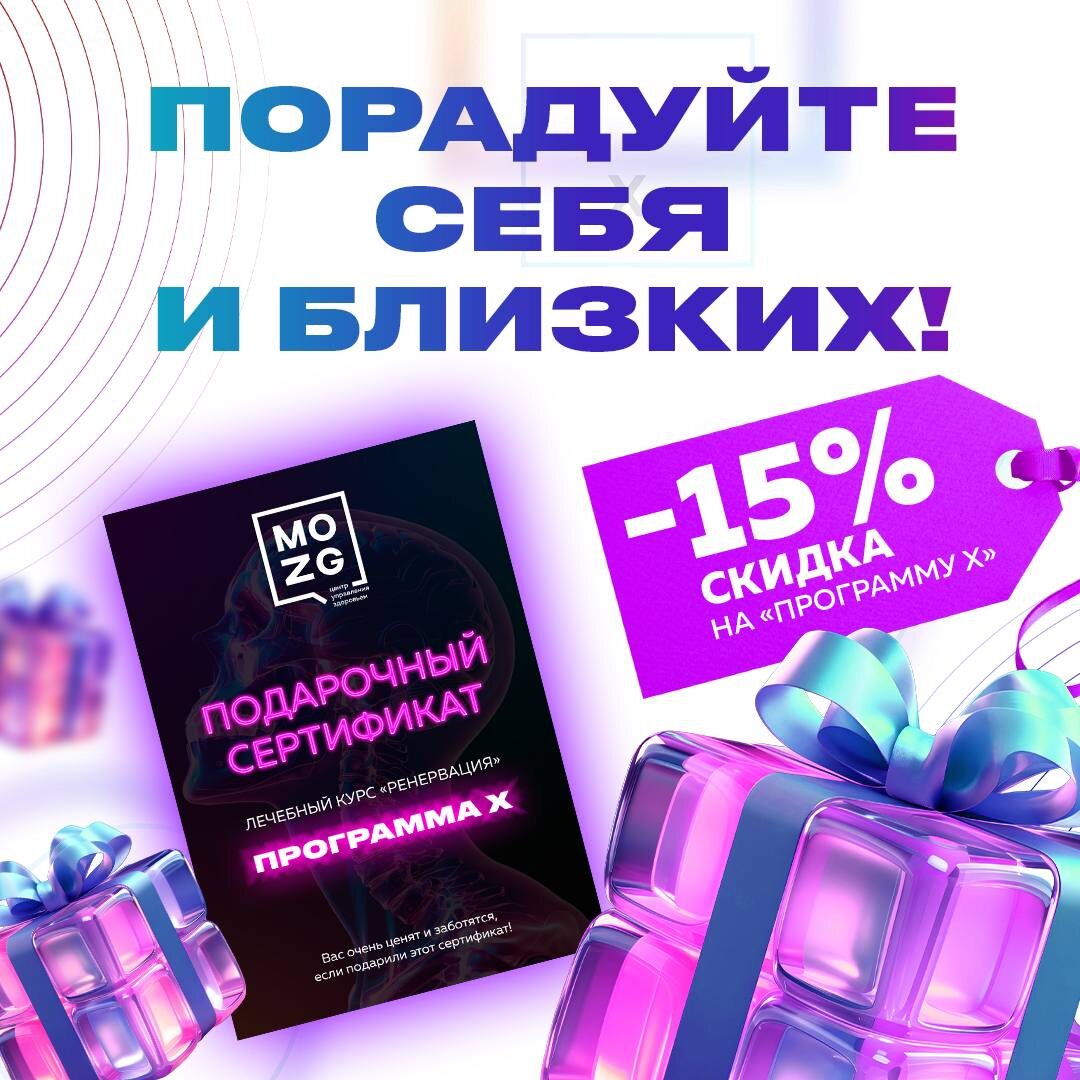 🔔 Скоро открытие наших новых центров🔔 Дорогие друзья, мы рады сообщить, что уже в конце сентября (возможны незначительные корректировки) откроются новые центры MOZG в Москве и Санкт-Петербурге, где вы сможете пройти нашу программу лечения. 🎁 Специальное предложение до конца июля для посетителей наших новых клиник! Подарите себе и близким подарочный сертификат со скидкой 15% на нашу услугу. Это идеальная возможность позаботиться о здоровье выгодно! 🔹 «Программа X» — инновационный подход к восстановлению ✔ Доступна с первых дней работы новых центров ✔ Персонализированный курс под наблюдением экспертов ✔ Доказанная эффективность методики 💡 Почему стоит приобрести сертификат сейчас? ✅ Экономия 15% на программу в наших новых центрах— предложение действует только до 31 июля (включительно) ✅ Гибкость использования — начало курса сразу после открытия новых центров ✅ Универсальный подарок — забота о здоровье близких Не упустите шанс начать осень с заботы о себе! 📅 Сертификаты со ски