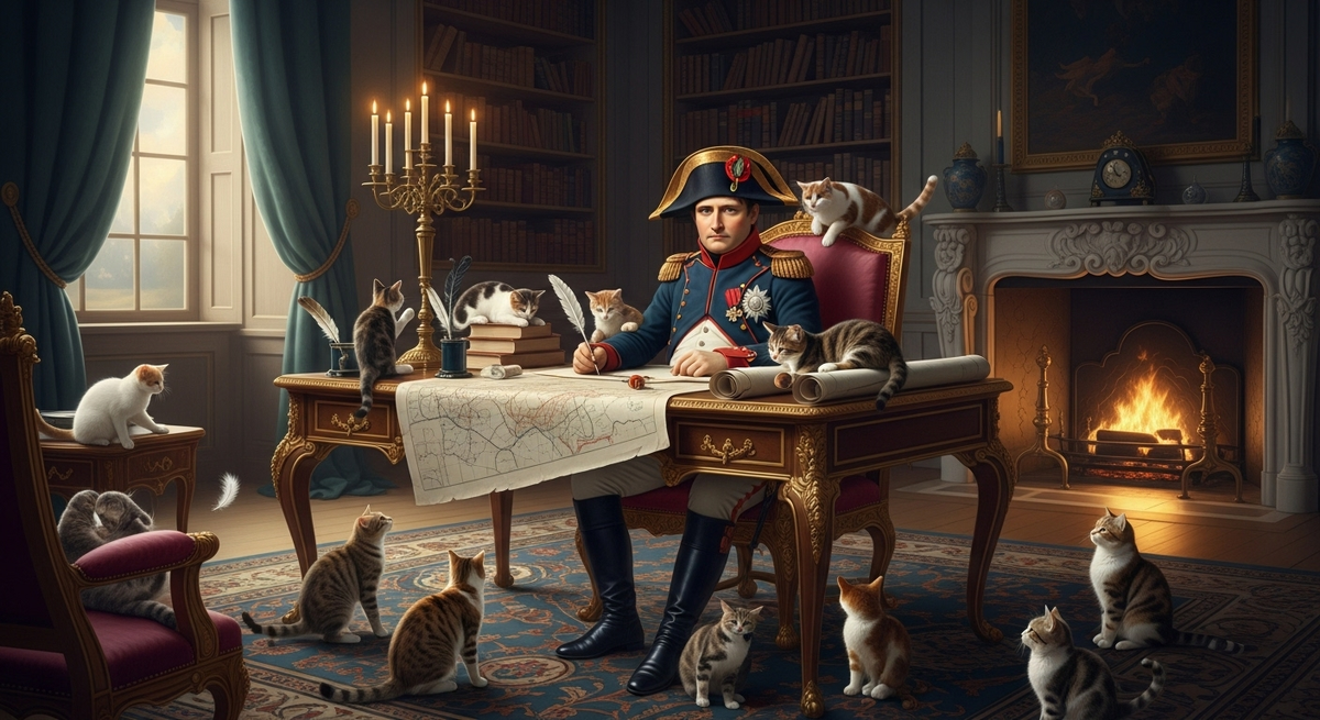 Знаете, что самое забавное в истории? Порой самые могущественные личности оказываются уязвимыми перед совершенно неожиданными вещами. Взять, к примеру, Наполеона Бонапарта — человека, который тряс Европу как грушу, а от вида котика готов был сбежать на край света. Представьте себе картину: сидит император, разрабатывает гениальный план по захвату очередной страны, а тут — на тебе! — вбегает маленький пушистый комочек, и всё, пиши пропало. Наполеон вскакивает как ошпаренный, начинает метаться по комнате, а его генералы стоят с вытаращенными глазами и думают: «Что это сейчас было?» Говорят, что страх — это как заноза в мозгу, только вытащить его куда сложнее. Вот и у Наполеона сидела такая заноза в виде айлурофобии — боязни кошек. Представьте себе: император, полководец, а боится пушистых комочков! Историки, как всегда, разводят демагогию. Одни твердят, что всё началось в детстве, когда маленький Наполеон, возможно, получил от кошки «чёрную метку». Другие утверждают, что дело в средневе