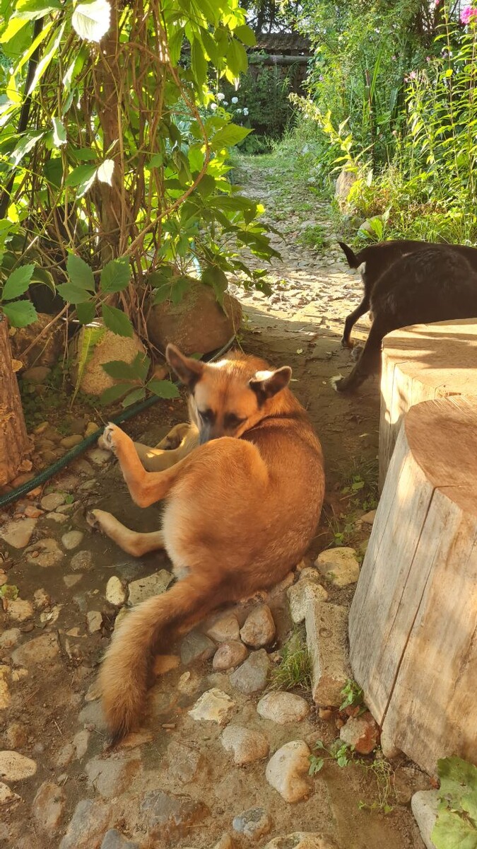 Греюсь на зактном солнышке после душа и любуюсь на собачью стайку.
