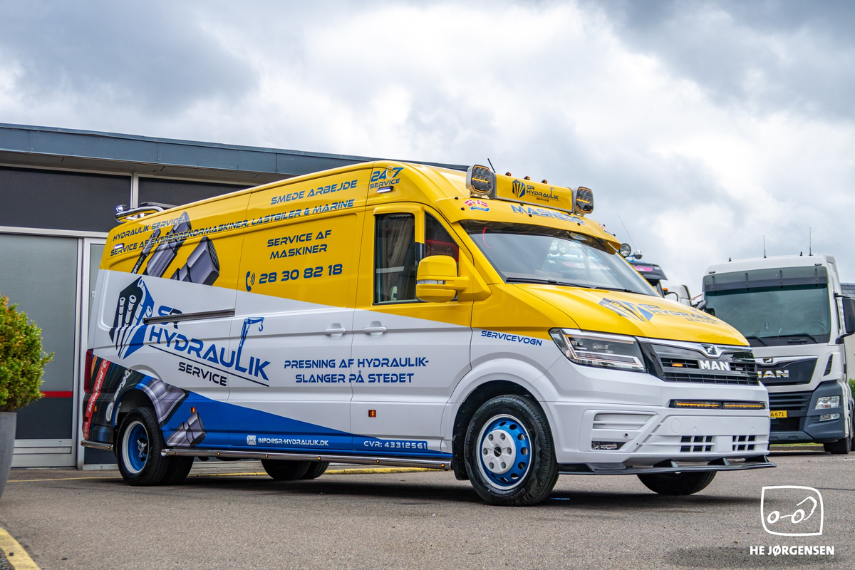 Датская компания SR Hydraulic Service недавно подобрала MAN-a TGE в Редко встречающейся конфигурации 5-тонного фургона. Этот автомобиль был официально зарегистрирован на 5 тонн DMC, поэтому он будет соответствовать типичным требованиям для грузовиков, и, кстати, получил типичную настройку грузовиков, охватывающую как внешний вид, так и интерьер салона. Новый автомобиль будет служить мобильным сервисом, работающим на ремонте строительной техники и гидравлических сооружений, таких как, например, самосвалы или краны. Это означает необходимость ездить на работу с относительно тяжелыми инструментами, и поэтому было принято решение о 5-тонной версии с двойными колесами, ограничителем скорости и тахографом, обеспечивающим около 2,1 тонны легальной полезной нагрузки. Подготовка к конкретной работе - это также очень богатый набор рабочего освещения над задней дверью, а также складная задняя ступенька, встроенная в крючок. Как и положено MAN-a TGE, а не Близнецу Volkswagen Crafter, представленны