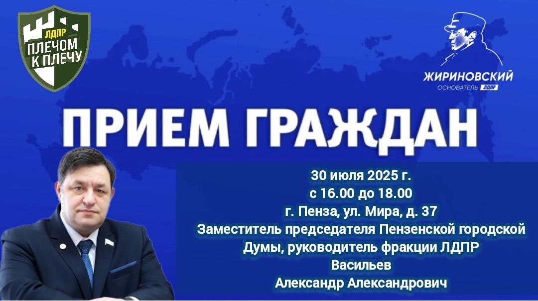 30 июля 2025 г. с 16:00 до 18:00 Заместитель председателя Пензенской городской Думы, руководитель фракции ЛДПР, и.о. координатора Пензенского регионального отделения ЛДПР Александр Васильев проведёт приём в общественной приёмной регионального отделения партии ЛДПР по адресу: г. Пенза, ул. Мира, 37 Телефон для записи: (8412) 999-667
