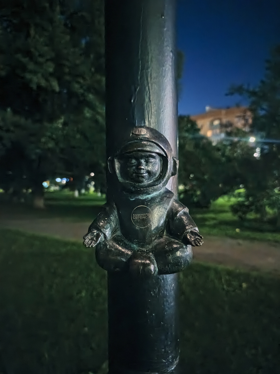 Итак, я отправился в это городское путешествие со своей 8-летней дочерью. Заранее я понимал, что ей будет интересно посещение крупнейшего в нашей стране музея, в котором рассказывается об истории космонавтики, потому что эта тема её привлекает. Но вот прогулки по городу, я боялся, будут ей немного скучны. Когда я путешествую один, то очень люблю рассматривать храмовую архитектуру, городские кирпичные и деревянные постройки. Готов часами гулять в поисках дома, в котором останавливался, например, Булат Окуджава (в Калуге он есть), сравнивать купеческие постройки в разных частях города. Но сразу возникает вопрос: как же поступить, чтобы это всё посмотреть и при этом сделать прогулку максимально интересно для ребёнка? И вот в интернете я случайно увидел, что в Калуге по всему городу расставлены маленькие скульптуры - "космонавтики". Они так названы, видимо, из-за своего небольшого размера. Признаюсь, я ожидал, что их "рост" будет достигать хотя бы сантиметров 50, поэтому найти первого нам было очень трудно. Тем более, что мы это делали уже в вечернее время, когда город погрузился во тьму.