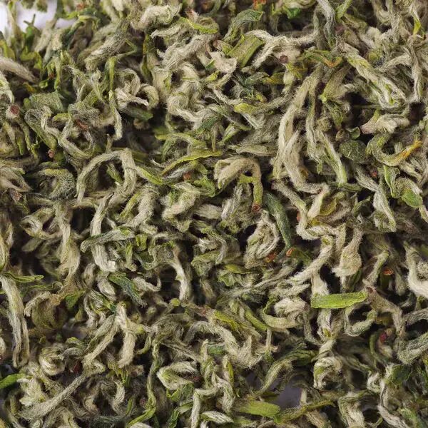 Вид сухого чая: маленькие спирали серебристо-зеленых почек, обильно покрытые ворсом.
