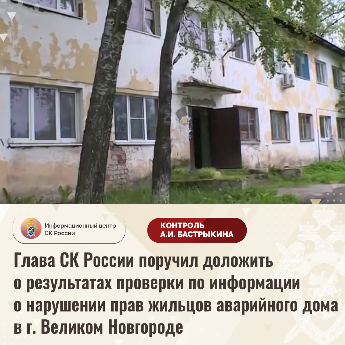 Глава СК России поручил доложить о результатах проверки по информации о нарушении прав жильцов аварийного дома в г. Великом Новгороде В СМИ сообщается о нарушении прав жильцов многоквартирного дома по улице Сенной города Великого Новгорода. Здание, 1957 года постройки, находится в непригодном состоянии: конструкции разрушаются, штукатурное покрытие осыпается, в стенах образовались трещины. В 2014 году одна часть строения признана аварийной, а в 2021 году указанный статус присвоен всему дому. Однако до настоящего времени благоустроенное жилье гражданам не предоставлено, из-за чего они вынуждены находиться в небезопасных условиях. Многочисленные обращения результатов не принесли. В СУ СК России по Новгородской области по данному факту проводится процессуальная проверка. Председатель Следственного комитета Российской Федерации Александр Иванович Бастрыкин поручил руководителю СУ СК России по Новгородской области Николаю Николаевичу Супруну доложить о промежуточных результатах процессуаль