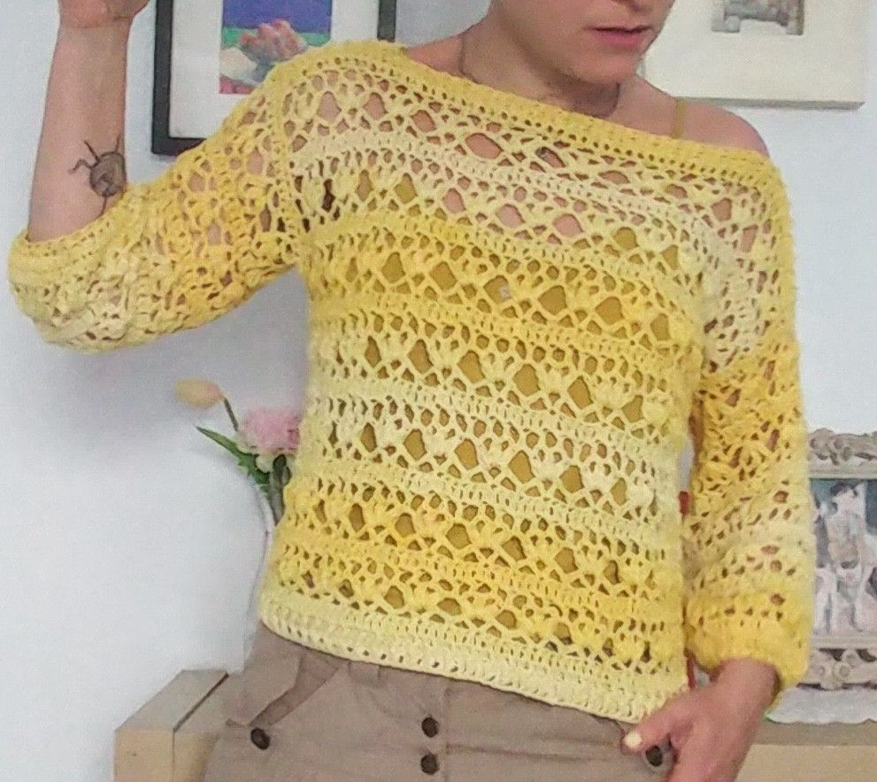 Джемпер крючком женский схема и описание обычно идут рука об руку. Описание текстом подробно рассказывает, сколько петель набрать, какие столбики вязать в каждом ряду, где делать прибавки или убавки для формирования пройм и горловины.