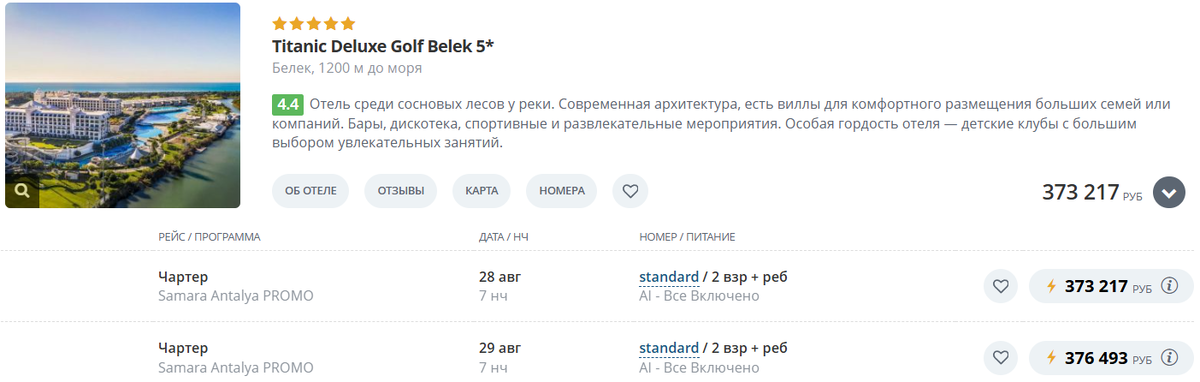 А теперь посмотрим сколько стоит отдых в этом чудо отеле и раз уж он считается семейным, сделаем подборочки туров на 2 взрослых и ребенка (5 лет), 7 ночей, "Все включено", вылет из аэропорта Самары: