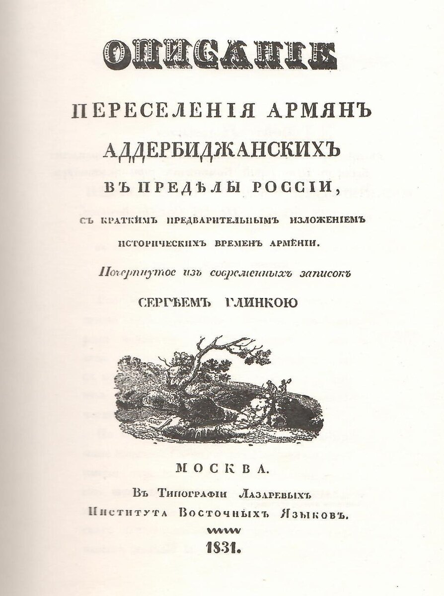 В 1831 году в Москве была издана книга известного тогда русского писателя-публициста Сергея Глинки «Описание переселения армян аддербиджанских в пределы России с кратким предварительным изложением исторических времен Армении». Отпечатанная в типографии Лазаревского Института Восточных языков, книга была призвана не только способствовать выводу христиан из-под власти магометанской Персии, - который автор расценивает как «доселе единственное в своем роде событие в летописях всемирных», - но и ознакомить русского читателя с историей Армении.
