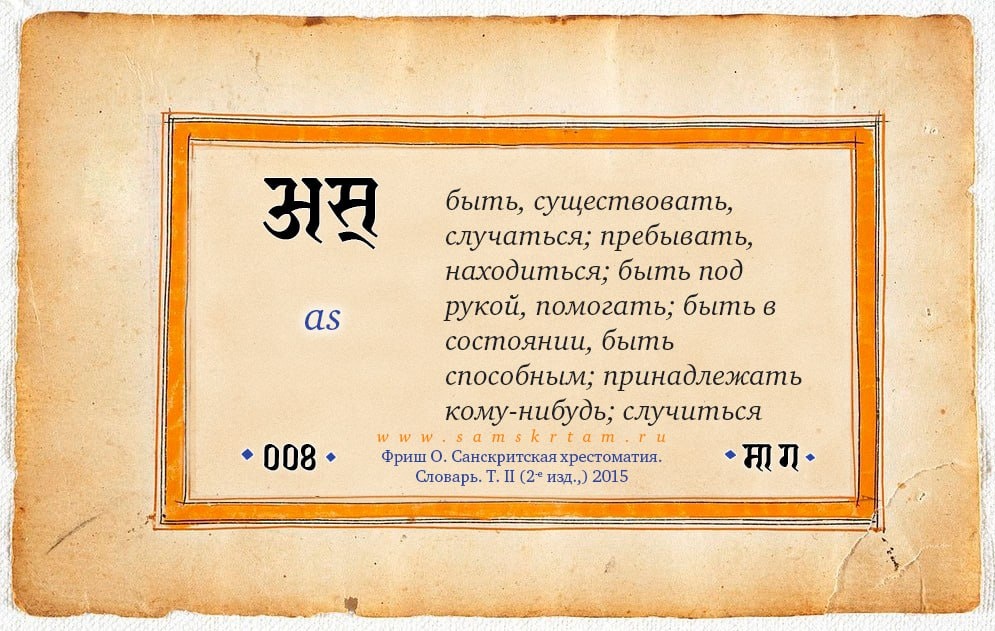 №8 "√as asti; быть, существовать, случаться; пребывать, находиться; быть под рукой, помогать; быть в состоянии, быть способным; принадлежать кому-нибудь; случиться" Фриш О. Санскритская хрестоматия. В 2 т. Т. 2. Словарь, 1956. https://samskrtam.ru/sanskrit-lexicon/small/frish_sm.html #словарь_Фриша