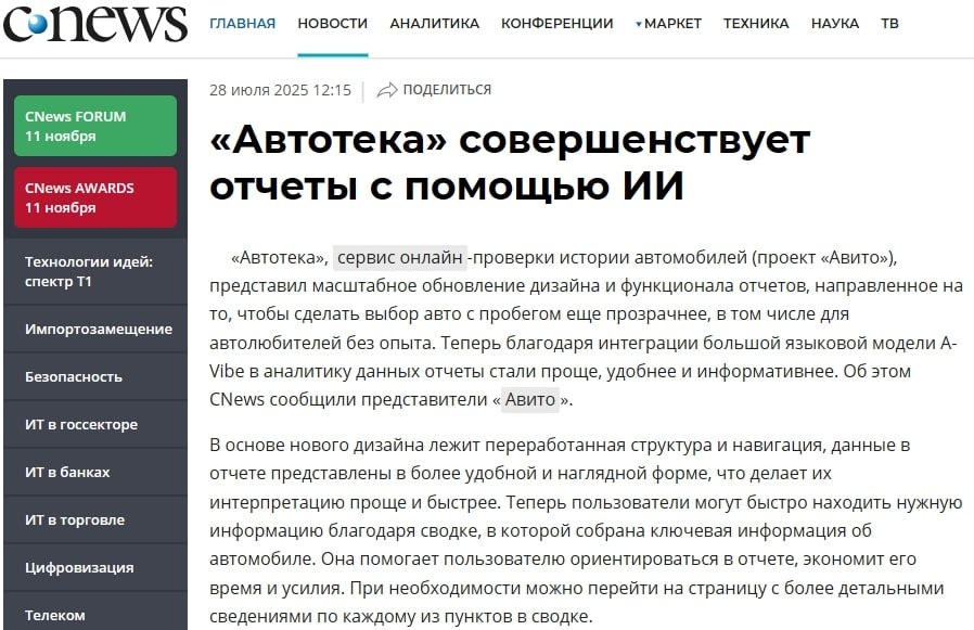 Автотека теперь с ИИ: интерактивная карта повреждений прямо в отчёте! Сервис прокачали на базе языковой модели Авито — теперь данные ГИБДД, страховых и сервисов автоматически превращаются в наглядную схему кузова. Каждое ДТП и ремонт — сразу на карте, видно, где и что чинили. Плюс новая структура и быстрая навигация. Вот это апгрейд для тех, кто не хочет покупать "кота в мешке". А ты бы перед покупкой машины чекал такие супер-отчёты или доверяешь только глазам? #Techtaim