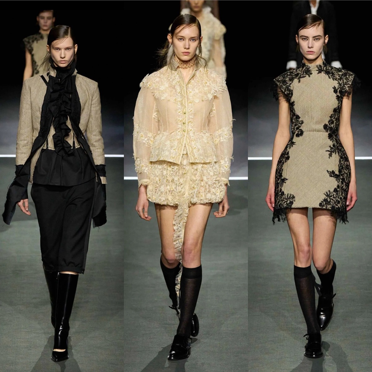 В парижском воздухе осеннего показа Dior осень-зима 2025 витает особая атмосфера преображения. Мария Грация Кьюри, словно искусный алхимик моды, творит волшебство, превращая привычные силуэты в символы новой эпохи. Её коллекция — это не просто одежда, а целая поэма о том, как платье может рассказать историю своего владельца. Мария Грация Кьюри создала удивительное повествование, вдохновлённое романом Вирджинии Вулф «Орландо». Подобно литературному произведению, бросающему вызов устоявшимся канонам, коллекция воспевает удивительную способность одежды преображать и трансформировать. Съёмные воротники придают коллекции особое очарование. Они словно метафора человеческой природы, способной к бесконечному преображению и поиску себя. В самом сердце показа — белоснежная рубашка, возведённая в ранг культового предмета гардероба. Коллекция раскрывается во всём своём великолепии: от пышных кринолинов до элегантных бриджей, от сюртуков со съёмными оборками до изысканных кружевных изделий,