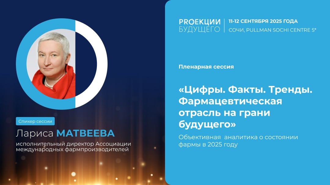 Представляем вам следующего спикера PROекций Будущего: 🔹Лариса Матвеева, исполнительный директор Ассоциации международных фармпроизводителей, спикер пленарной сессии «Цифры. Факты. Тренды. Фармацевтическая отрасль на грани будущего». На «PROекциях будущего» обсудим, как цифровая трансформация и внедрение искусственного интеллекта становятся катализаторами технологической революции в фарме, а также стратегию взаимодействия науки, бизнеса и власти. Дискуссия будет интересной – в панели соберутся авторитетные эксперты отрасли и вдохновляющие практики, которые не боятся быть частью изменений, ведь будущее создается теми, кто готов принять вызовы времени и уверенно двигаться вперед навстречу новым возможностям. Дата и время сессии: 11 сентября 2025, 09:30 📍г. Сочи, Pullman Сочи Центр 5* Подробнее о конференции и регистрация на сайте