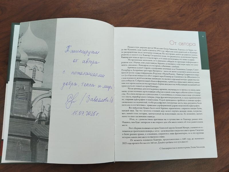 Жители поселка Новокашпирский сообщили о подарке, который получил микрорайон. «В наш поселок прибыла книга, посвященная истории Церкви Успения Божией Матери в Кашпире Сызранского уезда Симбирской губернии. Это не просто книга – это сокровищница архивных данных и документов, бережно собранных и повествующих об истории Кашпира с 1685 по 2022 год. Это бесценный вклад в сохранение памяти о малой родине, о людях, которые здесь жили и творили», - поделились жители поселка. Исторический сборник передала активу местного ТОС его составитель Завьялова Е.А., чьи корни глубоко уходят в эту землю. Благодаря ее кропотливому труду и любви к Кашпиру, читатели смогут совершить увлекательное путешествие во времени, погрузиться в атмосферу разных эпох. Языком архивных документов книга рассказывает об истории района Кашпир в разных эпохах. Бумажный экземпляр книги теперь хранится в ТОС «Новокашпирский», а все желающие могут в сети познакомиться с его электронной версией. Материал на сайте «маленькая Сызра