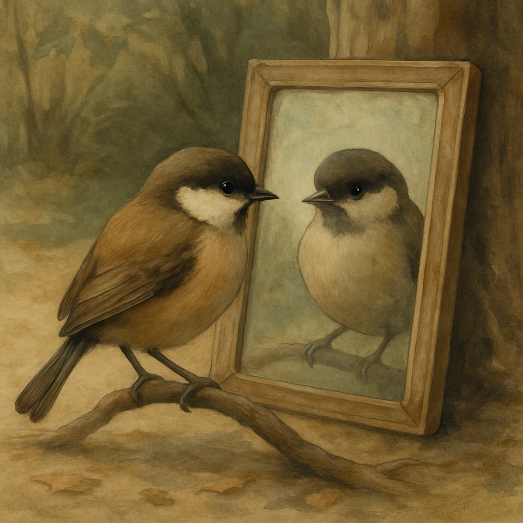 Маленькая птичка жила в лесу и однажды нашла зеркало, забытое человеком. Она заглянула в него — и увидела… другую птичку. — Кто ты? — чирикнула она. — Почему повторяешь мои движения? Но отражение молчало. Птичка обиделась и улетела. На следующий день вернулась — и снова увидела ту же «наглую» птицу. Прыгала, сердито чирикала, распушивала перья — а та, по ту сторону, делала всё то же. — Какая заносчивая! Всё копирует! Совсем меня не слышит! — воскликнула птичка и улетела совсем. А зеркало так и осталось — неподвижным, отражающим не кого-то... а её саму. Мораль: Мир часто показывает нам нас самих — в реакциях, в раздражении, в встречах с другими. Но мы не узнаём своё отражение и злимся на него, будто это кто-то другой.