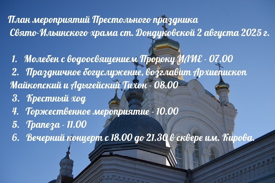 2 августа отмечается Ильин день, посвященный пророку Илье. В Свято-Ильинском храме пройдёт служба, а вечером в сквере им. Кирова состоится праздничный концерт. Приглашаем всех желающих! С планом мероприятий можно ознакомится в карточке ☝️