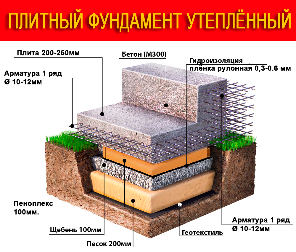 Многие не представляют, сколько тепла уходит в землю и не знают, как его удержать в доме. Этот короткий пример думаю, вам хорошо поможет. Подготовленное грунтовое основание (уплотнённое) Щебёночная подушка - 100 мм (фракция 20-40 мм) Песчаная подушка - 200 мм (уплотнённая) Гидроизоляция - рулонная плёнка 0,3-0,6 мм Утеплитель Пеноплэкс - 100 мм Бетонная плита - 200-250 мм (М300) Армирование - 1 слой сетки Ø10-12 мм. Использование экструзионного пенополистирола (Пеноплэкс) обеспечивает высокое теплосопротивление Однослойное армирование достаточно для малоэтажного строительства Комбинированная песчано-щебёночная подушка обеспечивает дренаж Температура в доме: +20°C Температура грунта: +5°C Площадь плиты: 100 м² (для примера) Теплосопротивление конструкции: Бетон 250 мм: R = 0,25/1,7 = 0,15 м²·°C/Вт Пеноплэкс 100 мм: R = 0,1/0,034 = 2,94 м²·°C/Вт Общее R: 0,15 + 2,94 = 3,09 м²·°C/Вт Сравнение с неутеплённой плитой: Без утеплителя: ≈100 Вт/м² С утеплителем 100 мм: ≈5 Вт/м² Экономия: до 9