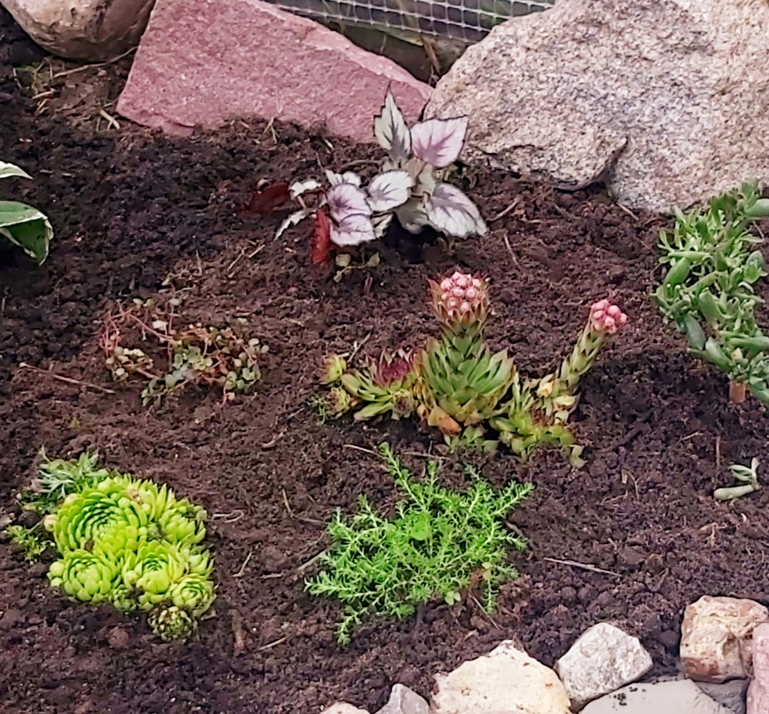 Итак, пруд мы сделали, камешки по периметру посадили на цементный раствор, теперь предстояло самое интересное - расположить береговые насаждения, установить фонтанчик, поселить прудовых жителей. На правом берегу у нас получился минисадик. Сюда переехала квартирная толстянка, офисная бегония, подаренное соседкой молодилло двух видов, одно из которых зацвело еще в ведре в ожиданнии пересадки, а так же, найденные в разных уголках участка коврики, кустик луговой гвоздики, неизвестные миникустики и красотка-хоста На противоволожном берегу расположились лягушата, черепашка, утки, ну и между всем этим великолепием установили фонтан. Только сразу он не заработал, потому что провозились с насаждениями мы до вечера, а фонтан наш на солнечной батарее, работает только когда солнышко. Но на следубщий день он зажурчал на радость всем, особенно Катюшке, ведь это был ее собственноручно собранный фонтан! За месяц берега пруда озеленились, минисадик подрос, а фонтан на удивление работает до сих по