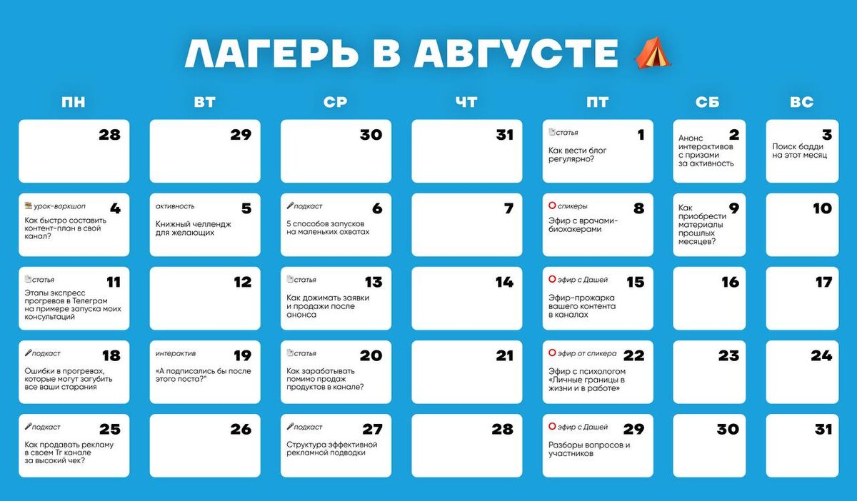 ДОБРО ПОЖАЛОВАТЬ В НОВЫЙ МЕСЯЦ КЛУБА ПО ТГ 😍 Тема августа — стратегия контента и быстрых запусков в Телеграм для канала любого масштаба Неважно, какой у вас охват, я расскажу, как вам делать продажи и запуски на желаемые суммы:) Что мы изучим — Как научиться вести блог регулярно без выпаданий? — 5 способов запусков на 100.000₽+ на любых охватах! — Этапы экспресс прогревов в Телеграм на примере запуска моих консультаций — Как дожимать заявки и продажи после анонса — Как продавать рекламу в своем Тг канале за высокий чек? — Структура эффективной рекламной подводки Подробнее расписание смотрите в календаре выше В каком формате это все будет, вас ждут: ✔️ Материалы каждую неделю в формате в подкастов с конспектами и статьях ✔️ 2 прямых эфира с ответами на вопросы и разборами от меня. Один из эфиров — прожарка-разбор ваших каналов!🔥 ✔️ Спикеры: врачи-Биохакеры и Психолог ✔️ Чат с ответами на вопросы от меня 🎁 Конкурс Активности с возможностью выиграть консультацию от меня и другие пр