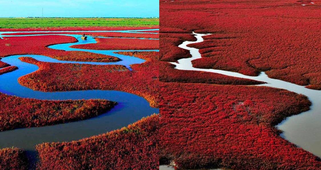 💡Красный пляж. Вместо песка Красный пляж Паньцзинь покрыт водорослями суеда, которые растут с апреля до глубокой осени. Летом они зелёные, а осенью становятся тёмно-красными, придавая пейзажу необычный, почти неземной вид. #красота #природа #красныйпляж