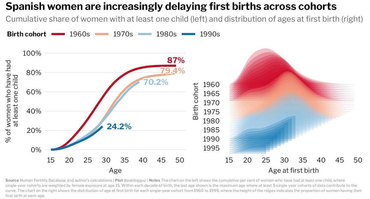 Жительницы Испании во всех возрастных группах всё чаще откладывают материнство К собственным 29 годам 54 % женщин, родившихся в 1960-х годах, стали матерями В возрастной группе женщин поколения 1990-х этот показатель составляет всего 24 % к соответствующему возрасту У поколения женщин 1960-х г.р. 13 % оказались итогово бездетными — у поколений 1980-х г.р. этот показатель будет порядка 23 %, у поколения 1990-х 25-30 % Также сместился самый частый возраст первых родов: с 25 лет у поколения 1960-х г.р. до примерно 33 лет у поколения 1990-х г.р. Столь сильный сдвиг влияет на коэффициент рождаемости, снижается его Текущий СКР Испании в 1.1 На графике доля рожавших среди поколений женщин Испании, а также частотное распределение возраста их первых родов