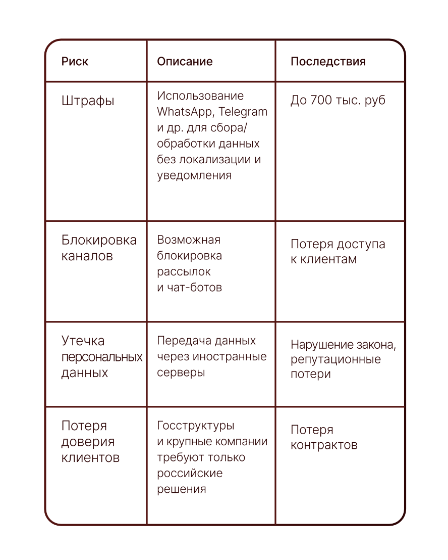 - Собирать персональные данные напрямую в WhatsApp или Telegram (например, через Telegram-бота или в чате), если данные сразу уходят на иностранные серверы, без промежуточной обработки на территории РФ.