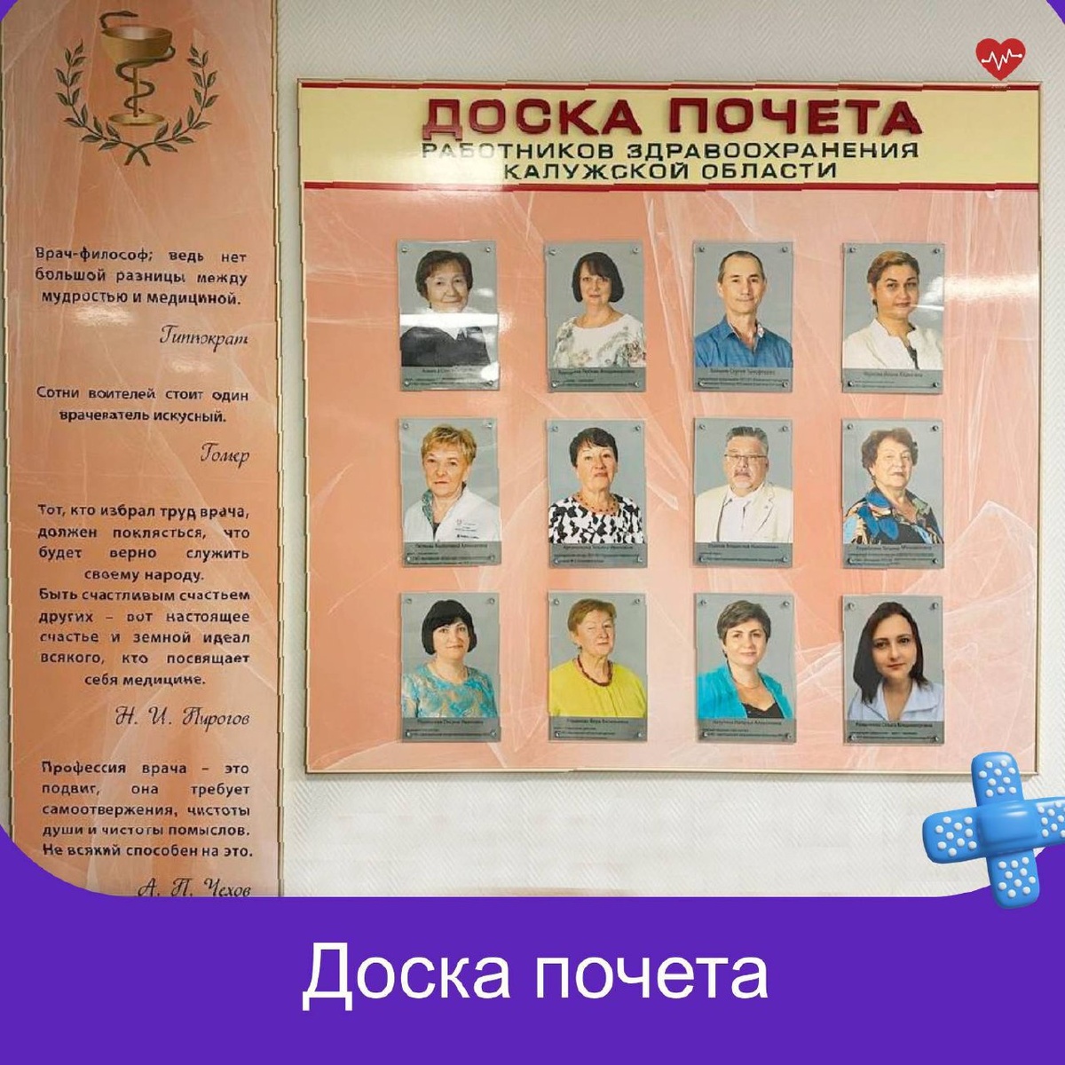 Обновили доску Почета медицинских работников Калужской области. Доска Почета обновляется ежегодно. Здесь отмечены медицинские работники за высокое профессиональное мастерство, добросовестный труд, итоги профессиональной деятельности и владение смежными специальностями. Всего 12 медиков из городских, областных и районных больниц: медицинские сестры, фельдшера, врачи, заведующие отделениями и главные врачи. Люди самых разных медицинских специальностей, но настоящие профессионалы своего дела! Поздравляем всех, чьи имена украшают доску Почета. Желаем новых трудовых свершений и успехов!